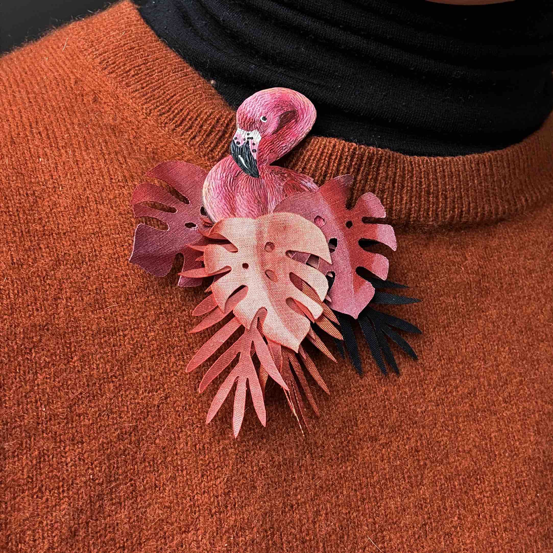 Embrace vibrant tropical style and artisan elegance—order your Flamingo Totumo Brooch today and add a unique, sustainable statement accessory to your collection.