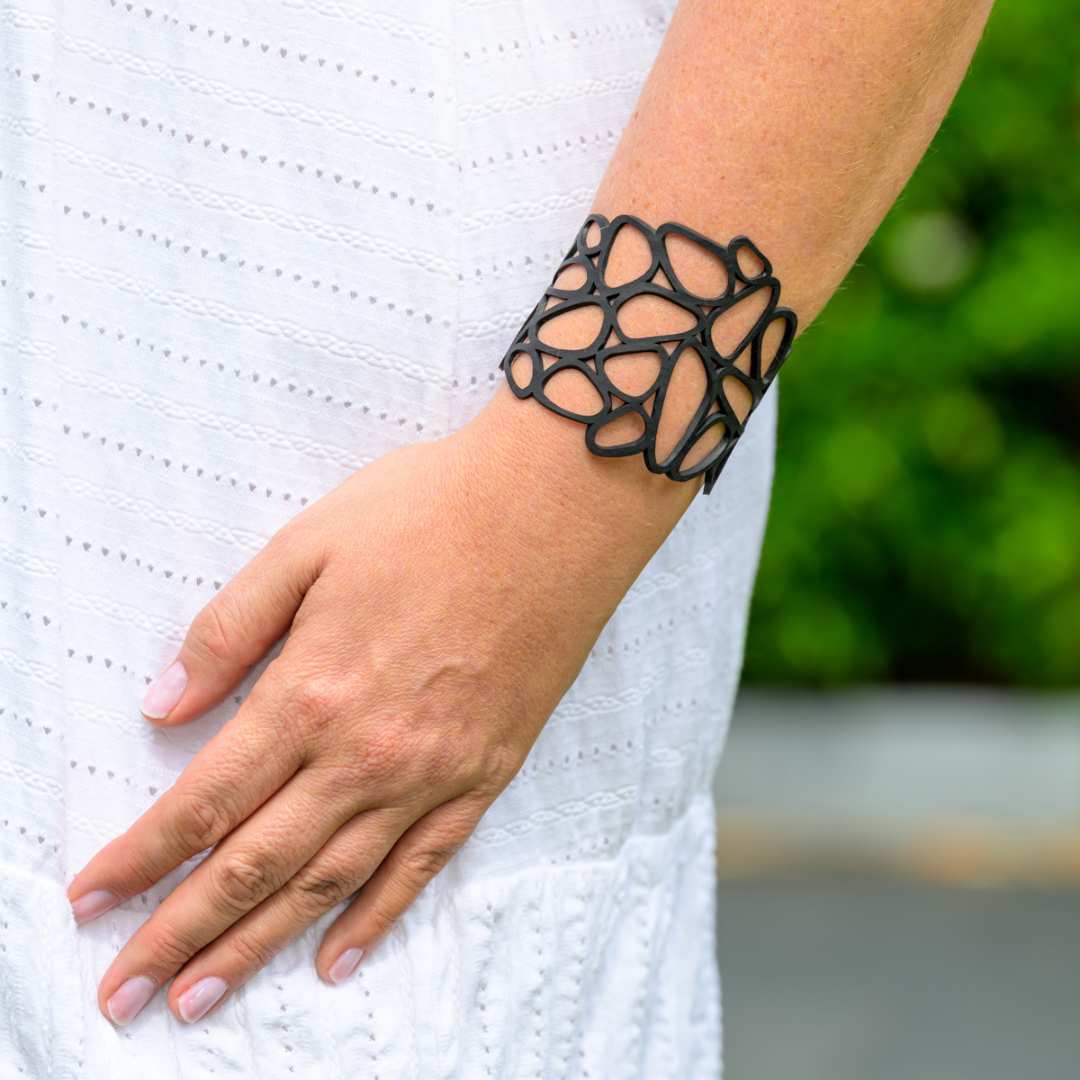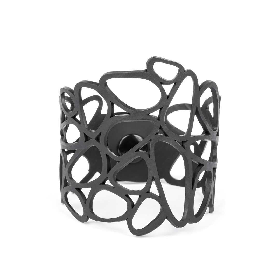 The recycled rubber is retrieved from old industrial printing machines. When the printers reach the end of their lives, they will be broken up and sold for scrap. We reclaim the rubber belts and use them for jewellery instead. With variations in texture and colour, all of the pieces are unique.
