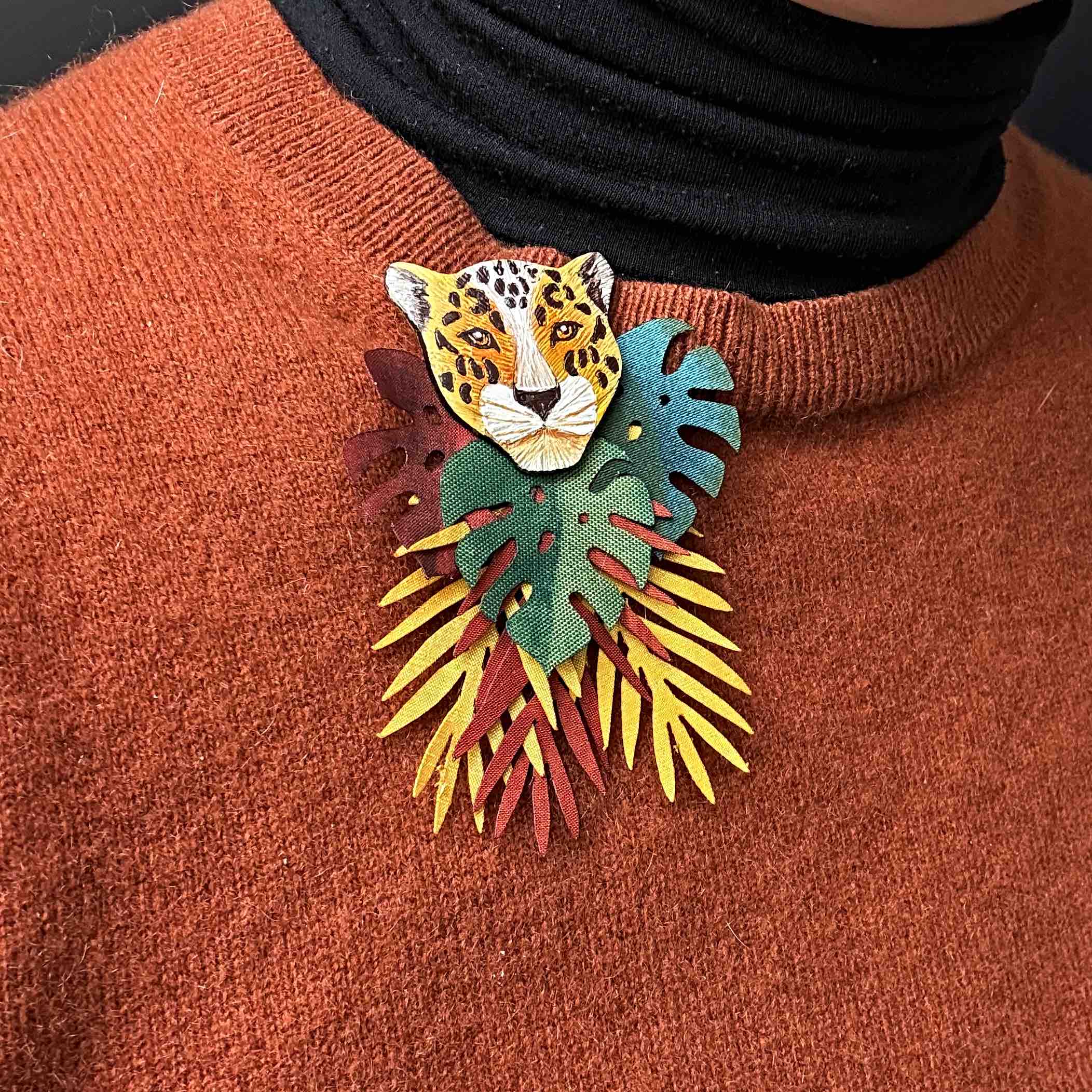 Bold, powerful and beautifully handcrafted, this Jaguar Brooch celebrates the spirit of one of the most iconic animals of the rainforest. Inspired by the majestic jaguar, the design captures its distinctive markings and graceful strength through vibrant colours and intricate artisan craftsmanship.